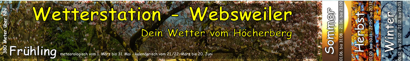 DieWetterstation"Websweiler"isteineprivateWetterstationund wirdvonMikeWeberbetrieben.DieStationhatam15.Februar2007ihrenBetriebinWebsweileraufgenommen.SeitdiesemTag werdendieWetterdatenvonderStationaufgezeichnet,unddie Daten im Internet veröffentlicht.WebsweilerliegtamnördlichenTeildesSaar-PfalzKreisesauf einer Höhe von ca. 380 Meter über Normal Null. Mehr Info´s